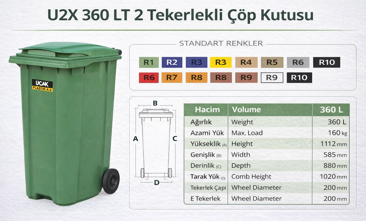 Uçak Plastik A.Ş., 2 tekerlekli çöp kutusu ürün serisini tamamlayarak; ulusal ve uluslararası ölçekte çok sayıda belediye, resmî kurum, toplu konut projeleri, hastaneler, okullar, oteller ve atık yönetimi firmalarının ihtiyaçlarına güvenilir çözümler sunmaktadır.